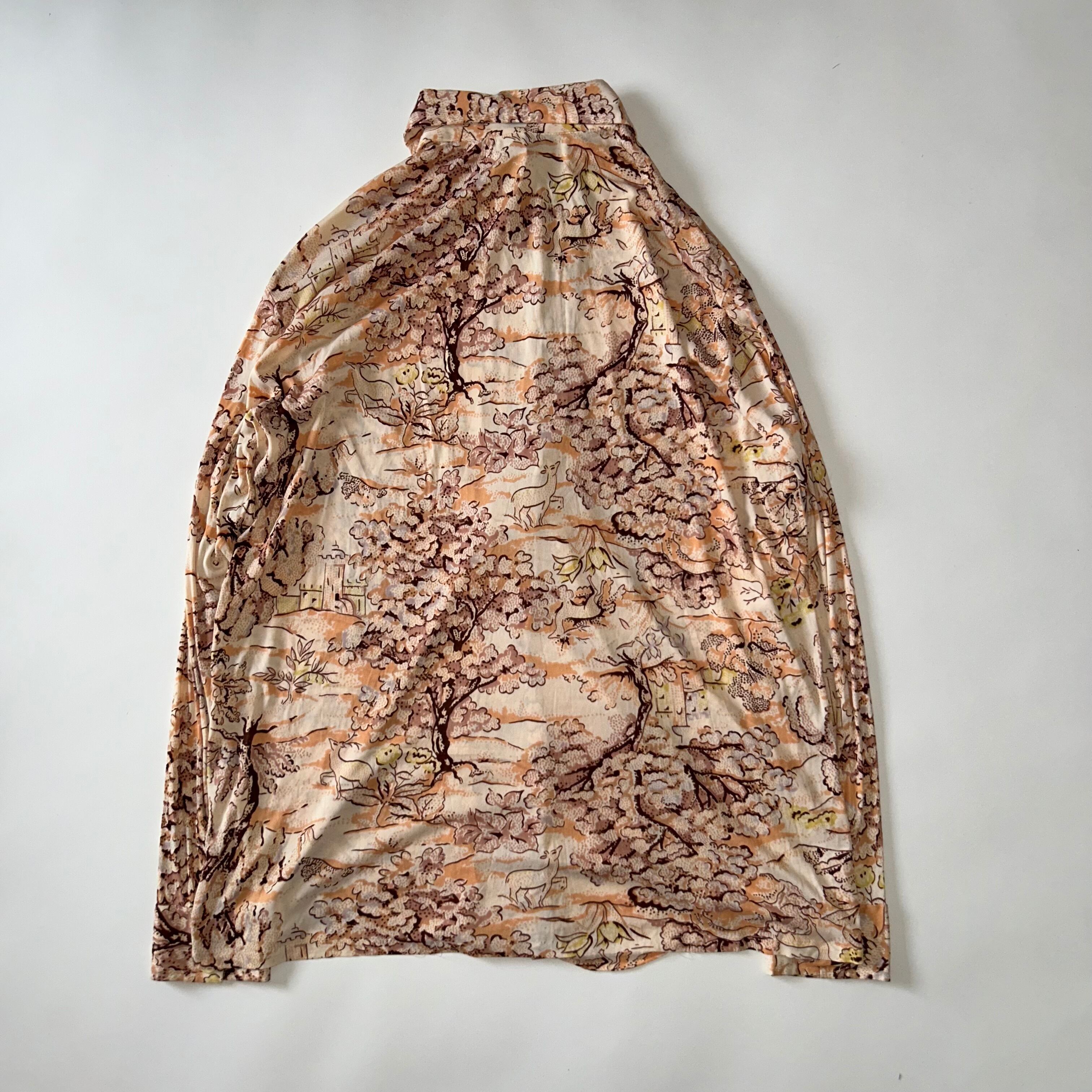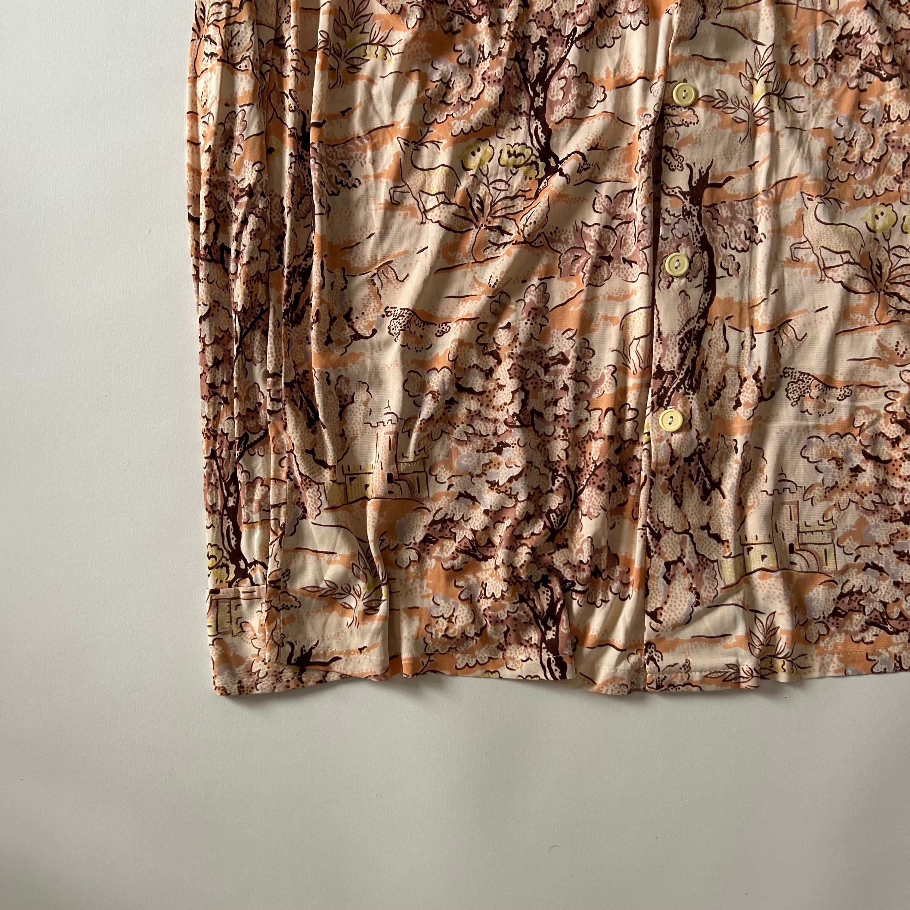 木々や建物を描いた風景モチーフのノベルティプリントが全面に入った、70sらしい雰囲気の一着。